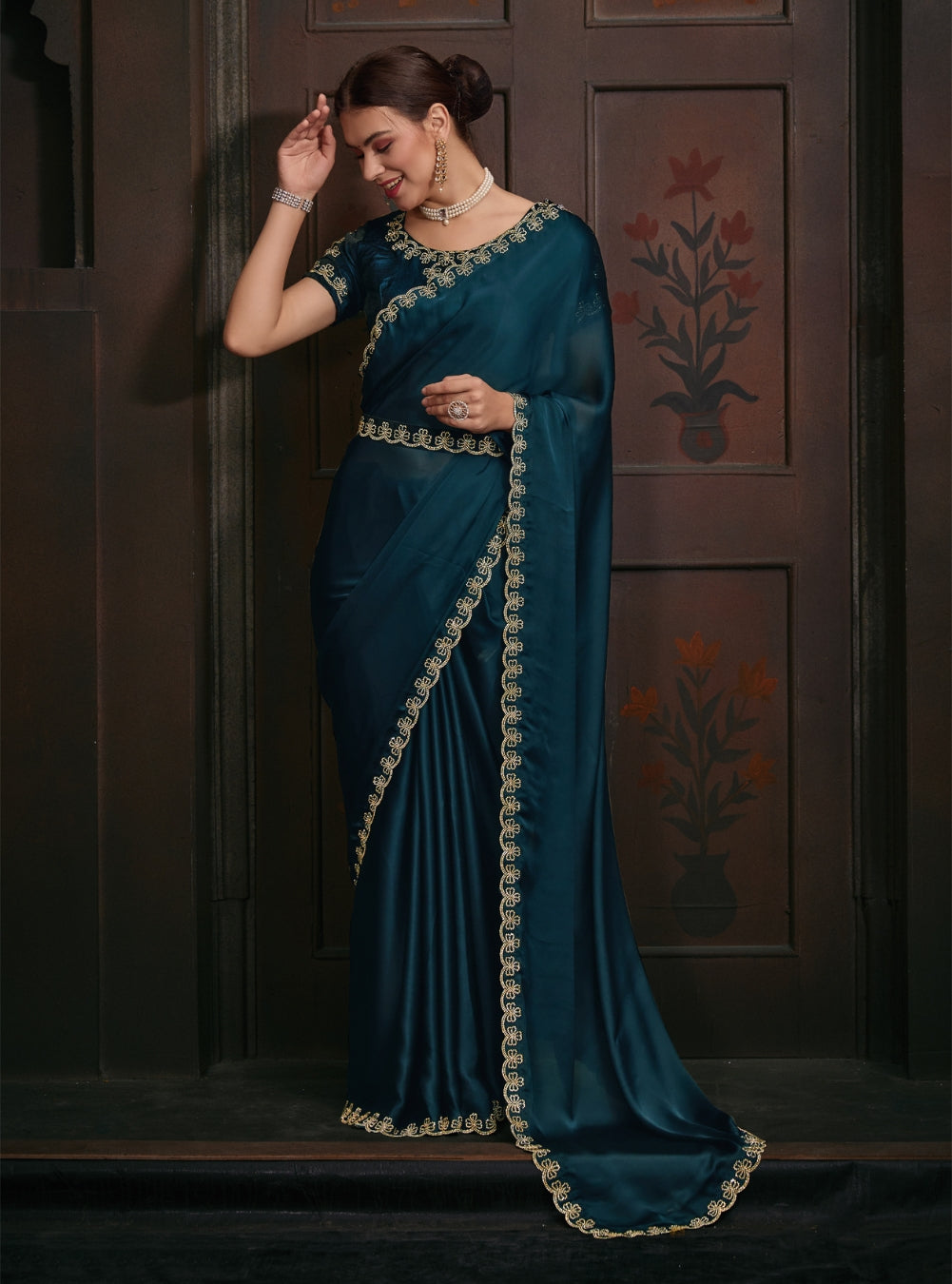 Teal Blue Stunning Premium Satin Silk Swarovski Work Saree