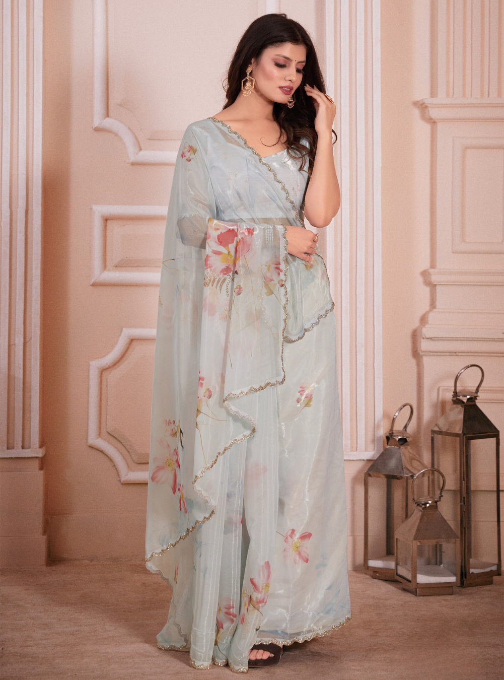 Pastel Blue Effortless Premium Metallic Organza Floral Digital Printed Saree