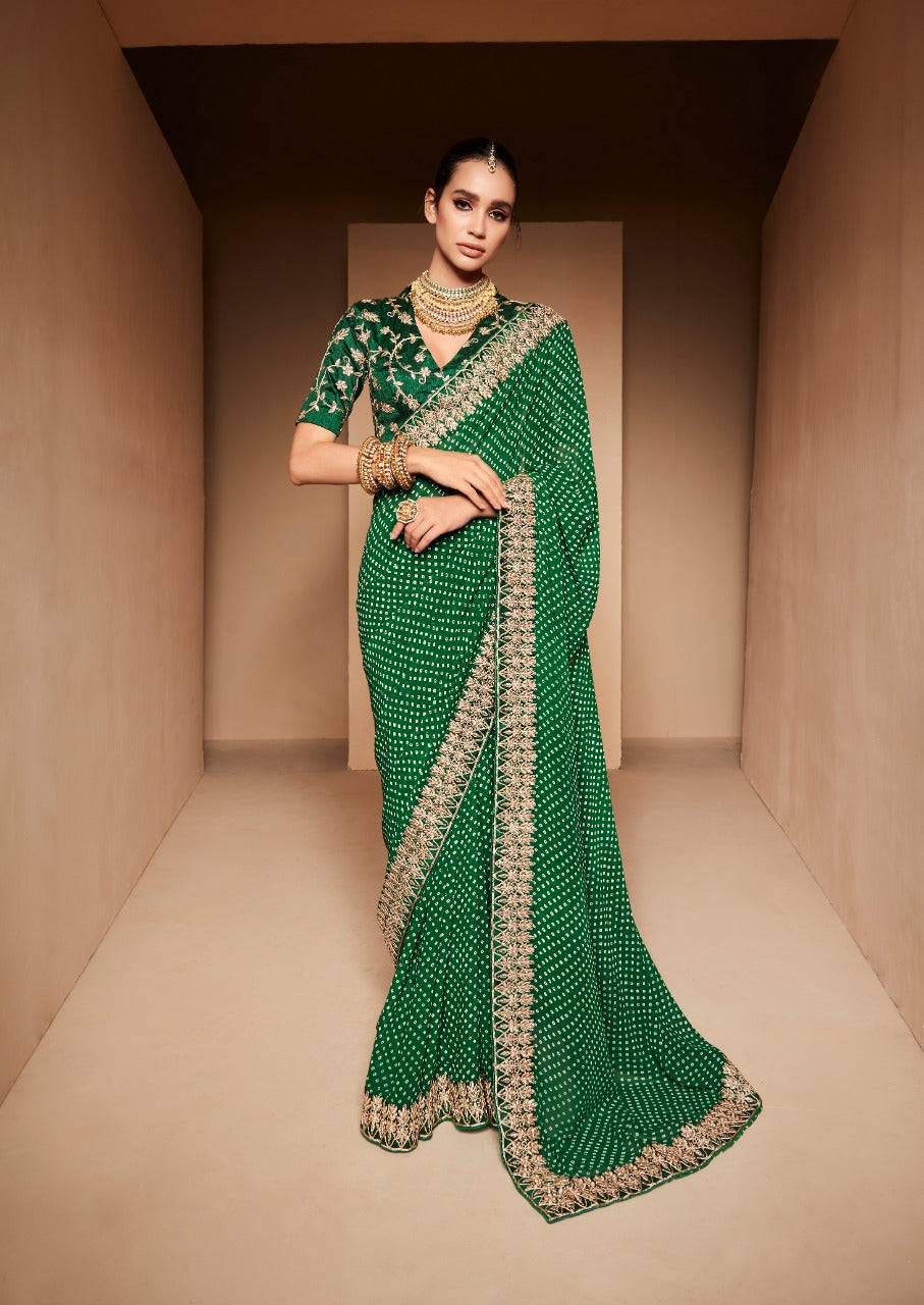 Bottle Green Heavy Georgette Traditional Printed Border Embroidered Saree