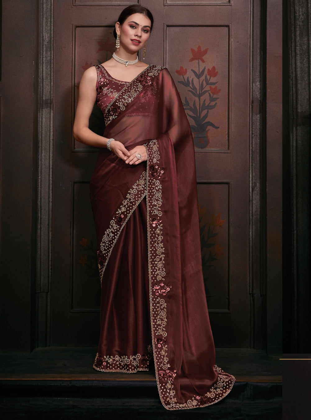 Brown Radiant Premium Metallic Organza Stone Work Saree