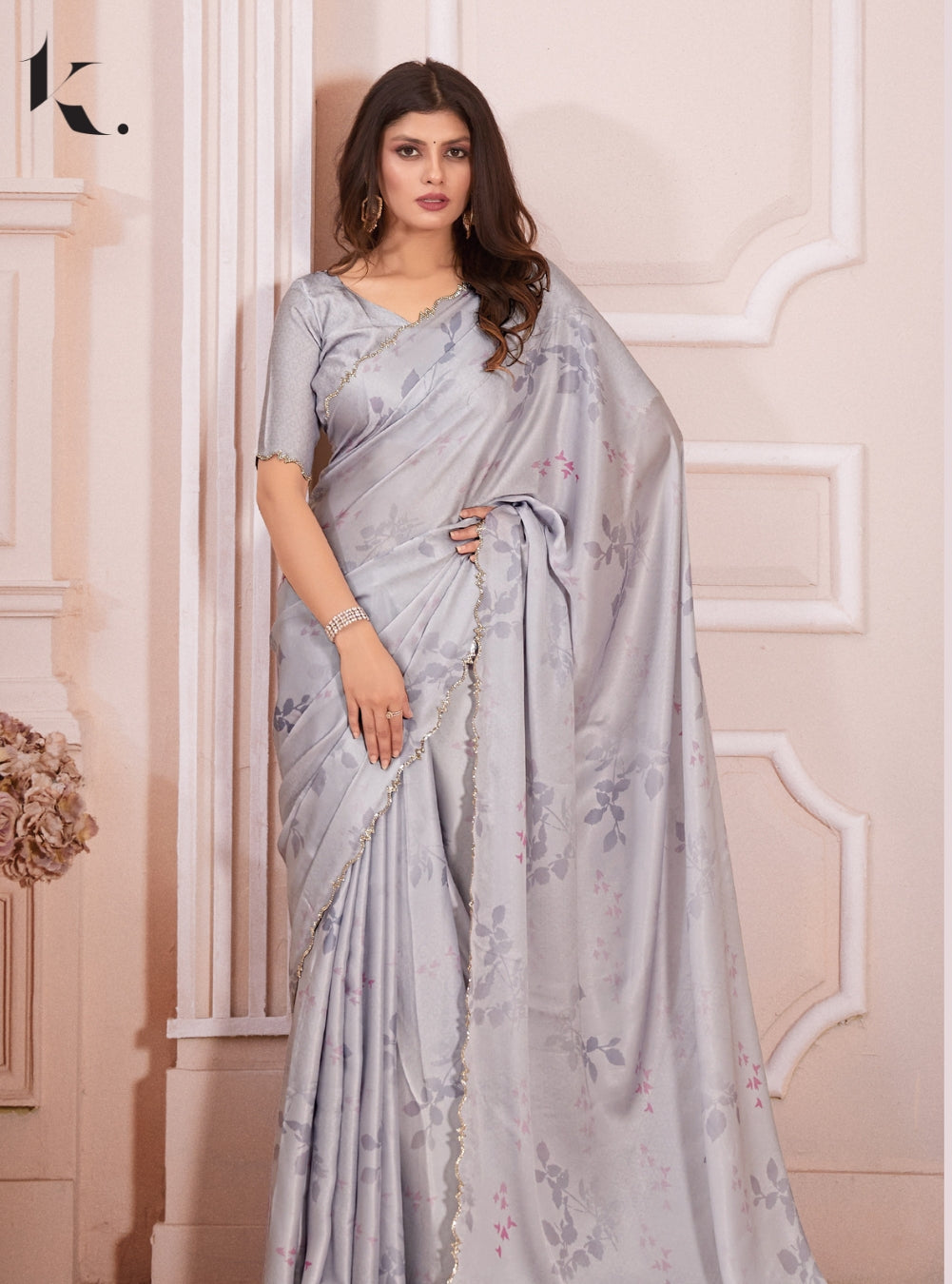 Grey Trendy Premium Satin Floral Digital Printed Saree
