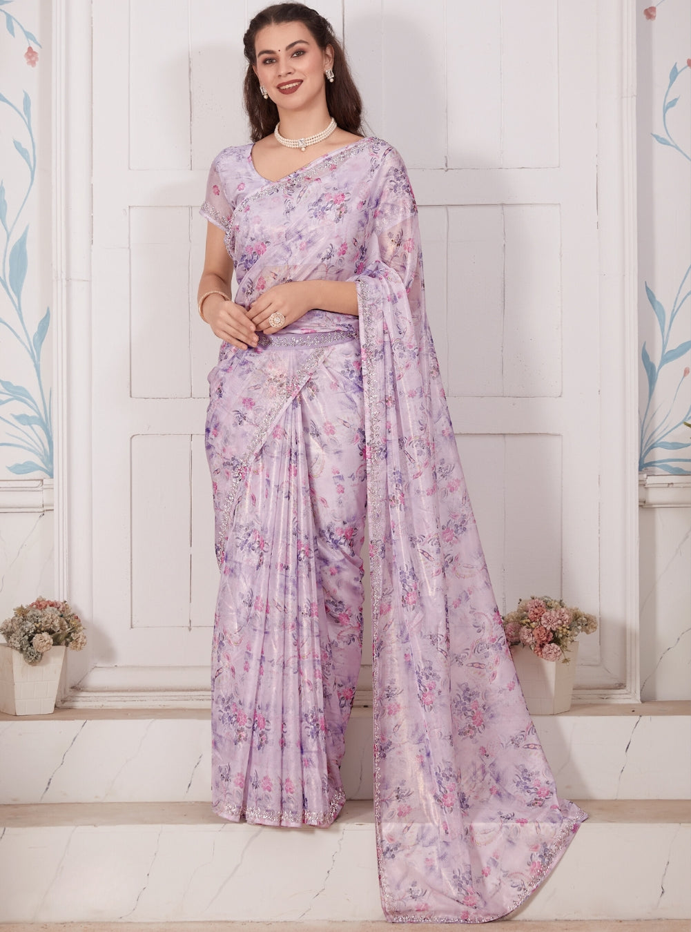 Lavender Radiant Premium Metallic Organza Floral Digital Printed Saree