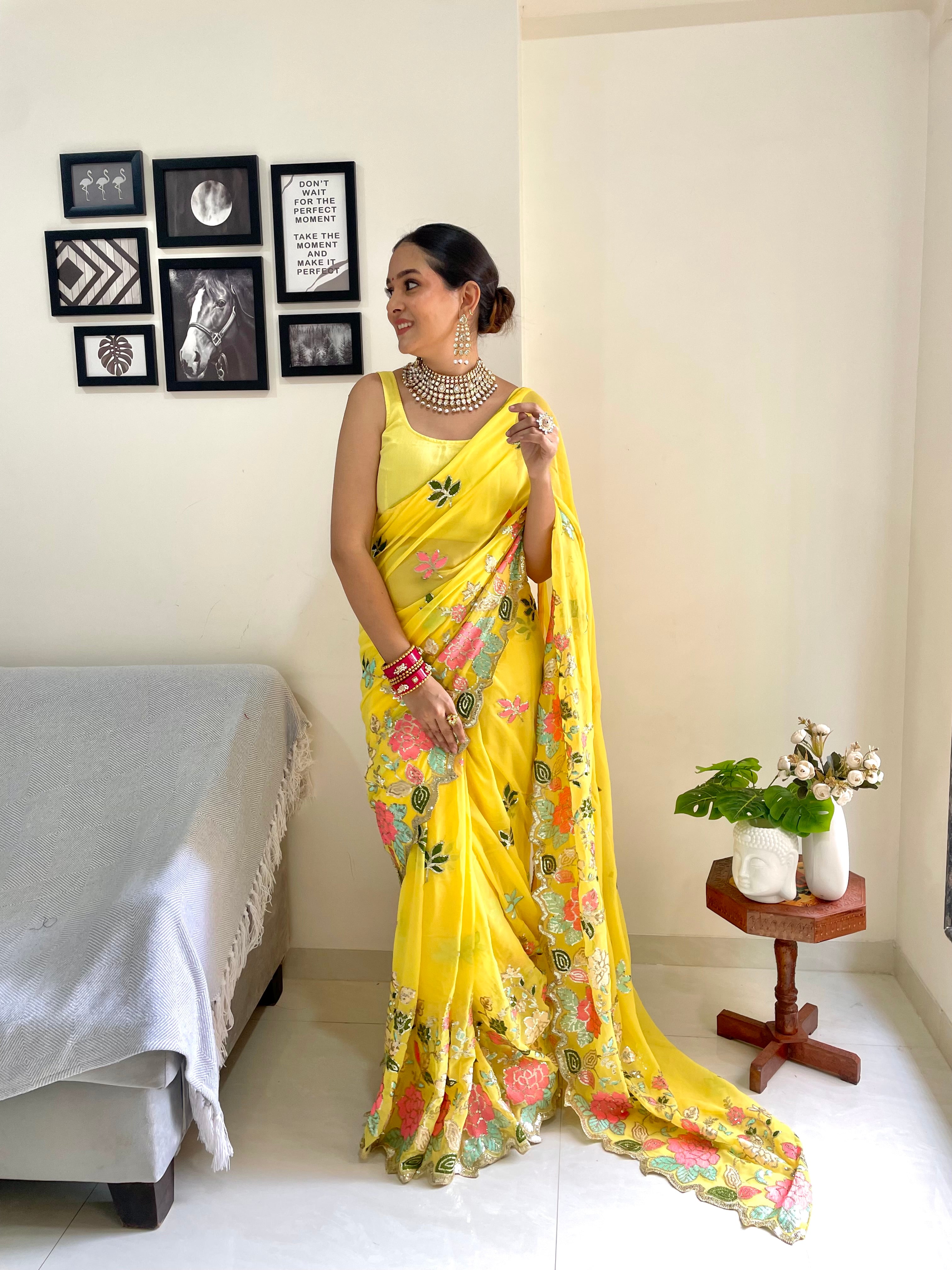 Mustard Yellow Designer Heavy Georgette Sequence Embroidered Work Saree