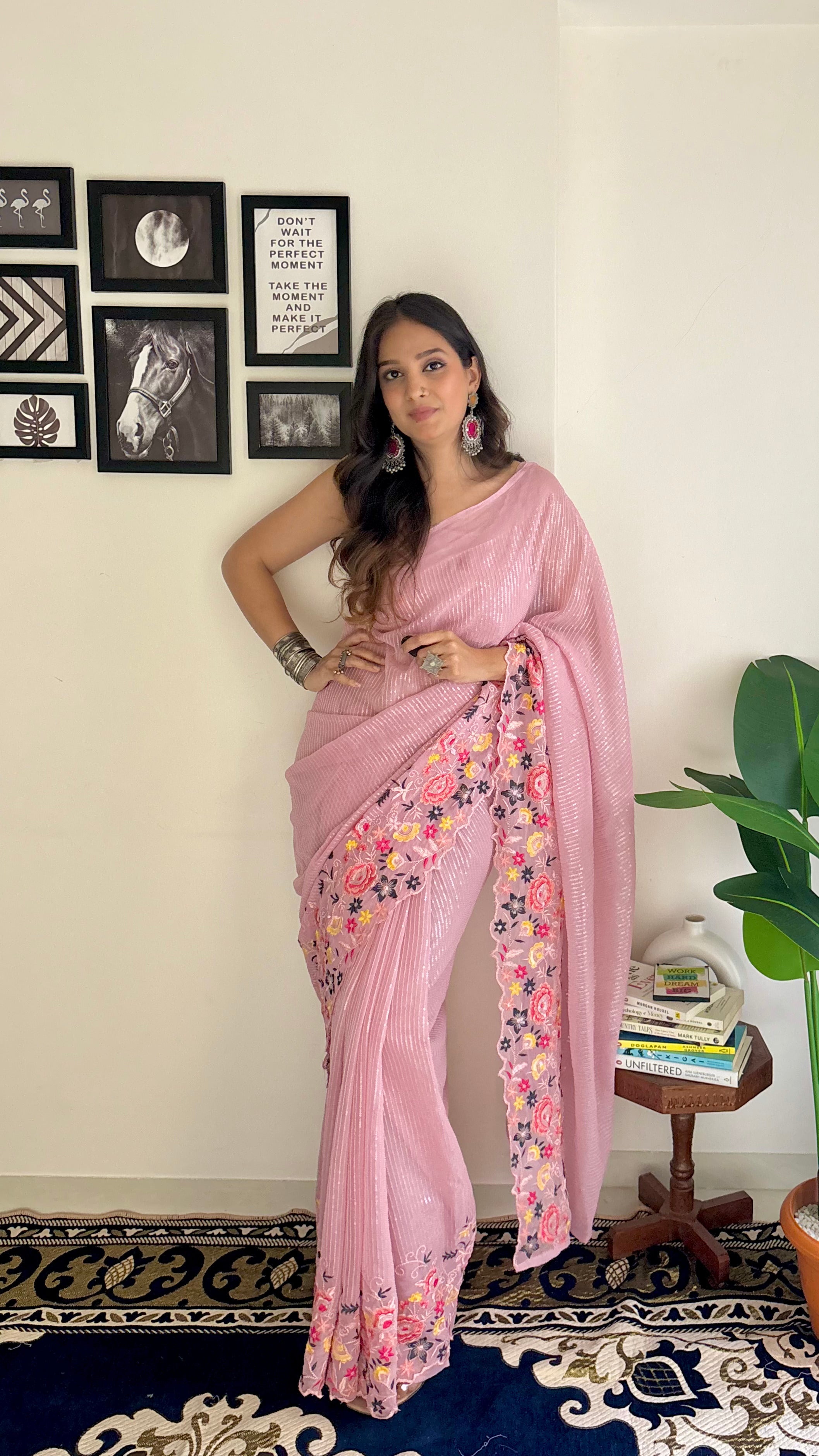Pre-stitched saree: The pleats are already stitched, so you just need to wrap it around your waist. Makes wearing the saree quick and easy.