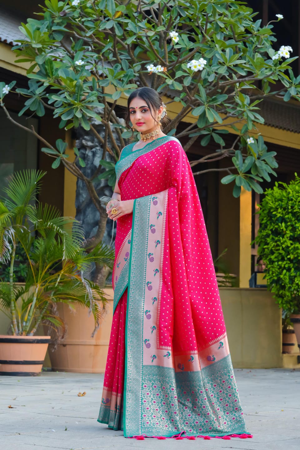 Pink Banarasi Soft Silk Zari Weaving Paithani Saree With Beautiful Contrast Peacock Border