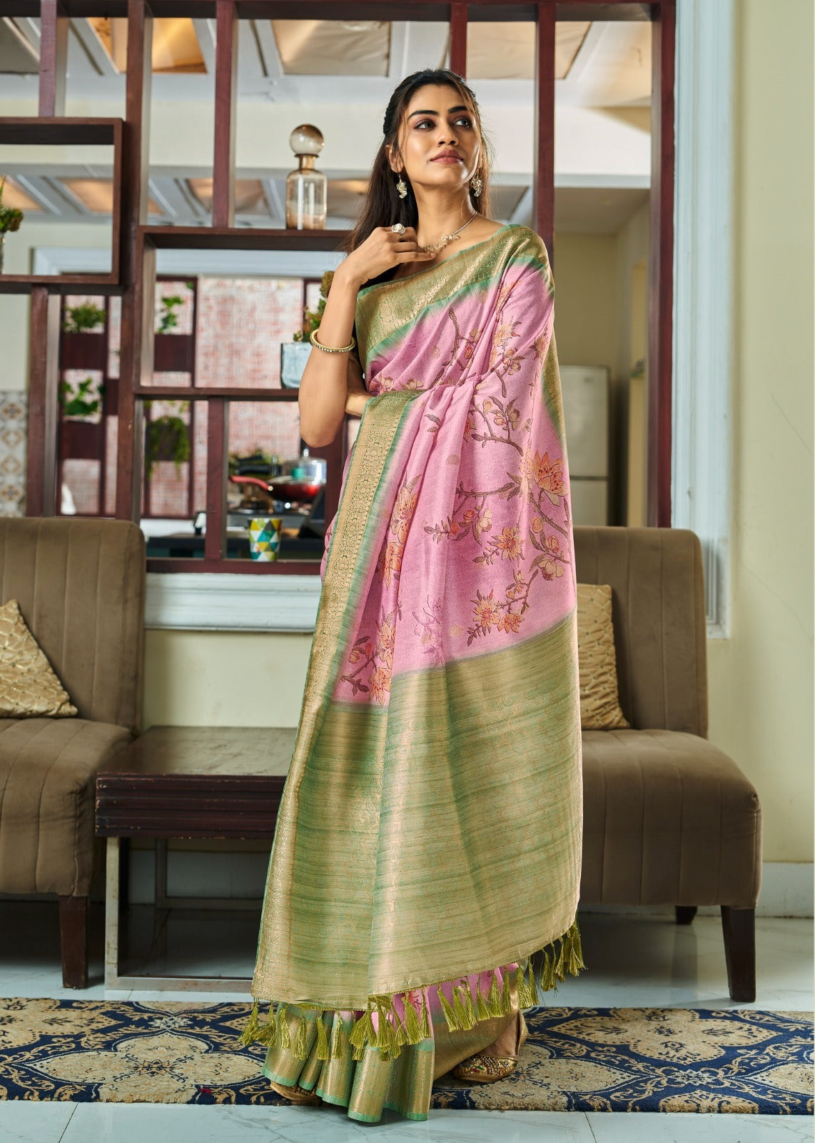 Pink Pure Handloom Kotha Silk Floral Printed Zari Weaving Saree
