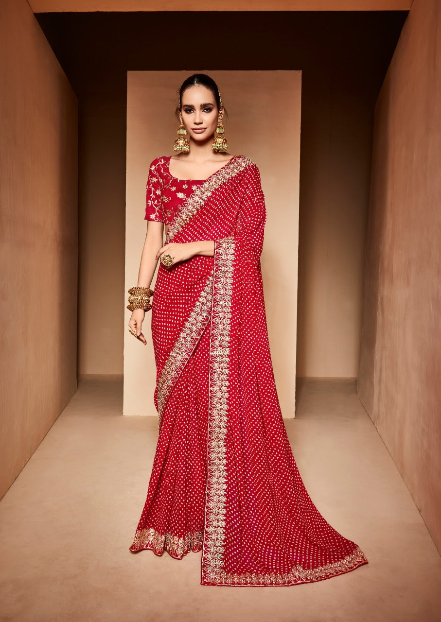 Red Heavy Georgette Traditional Printed Border Embroidered Saree