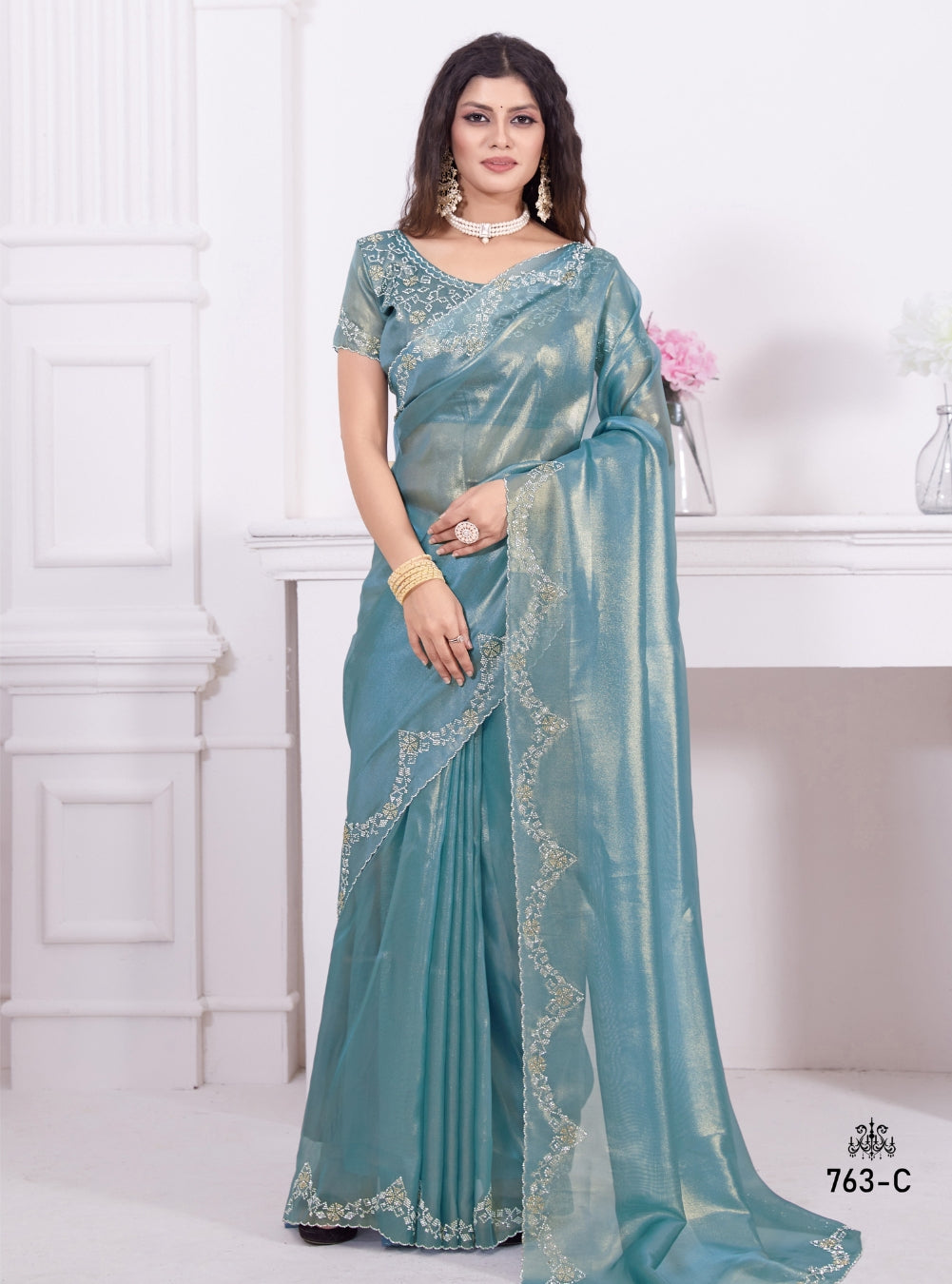 Sky Blue Beautiful Premium Metallic Organza Stone Work Saree