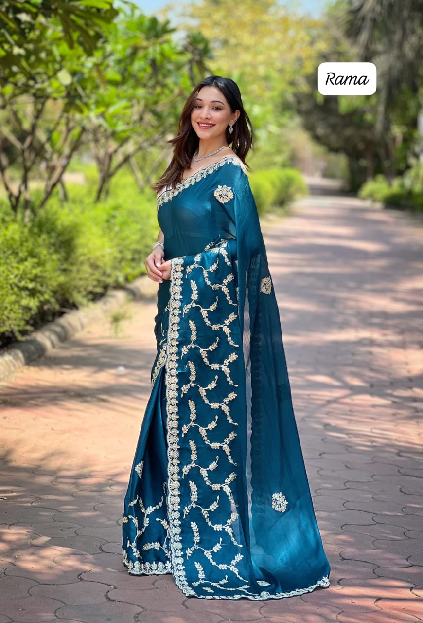 Teal Blue Soft Satin Chiffon Foil Thread Embroidered Work Saree