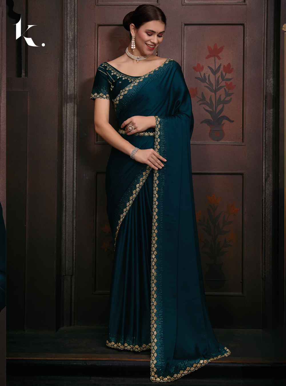 Teal Blue Radiant Premium Satin Silk Swarovski Work Saree