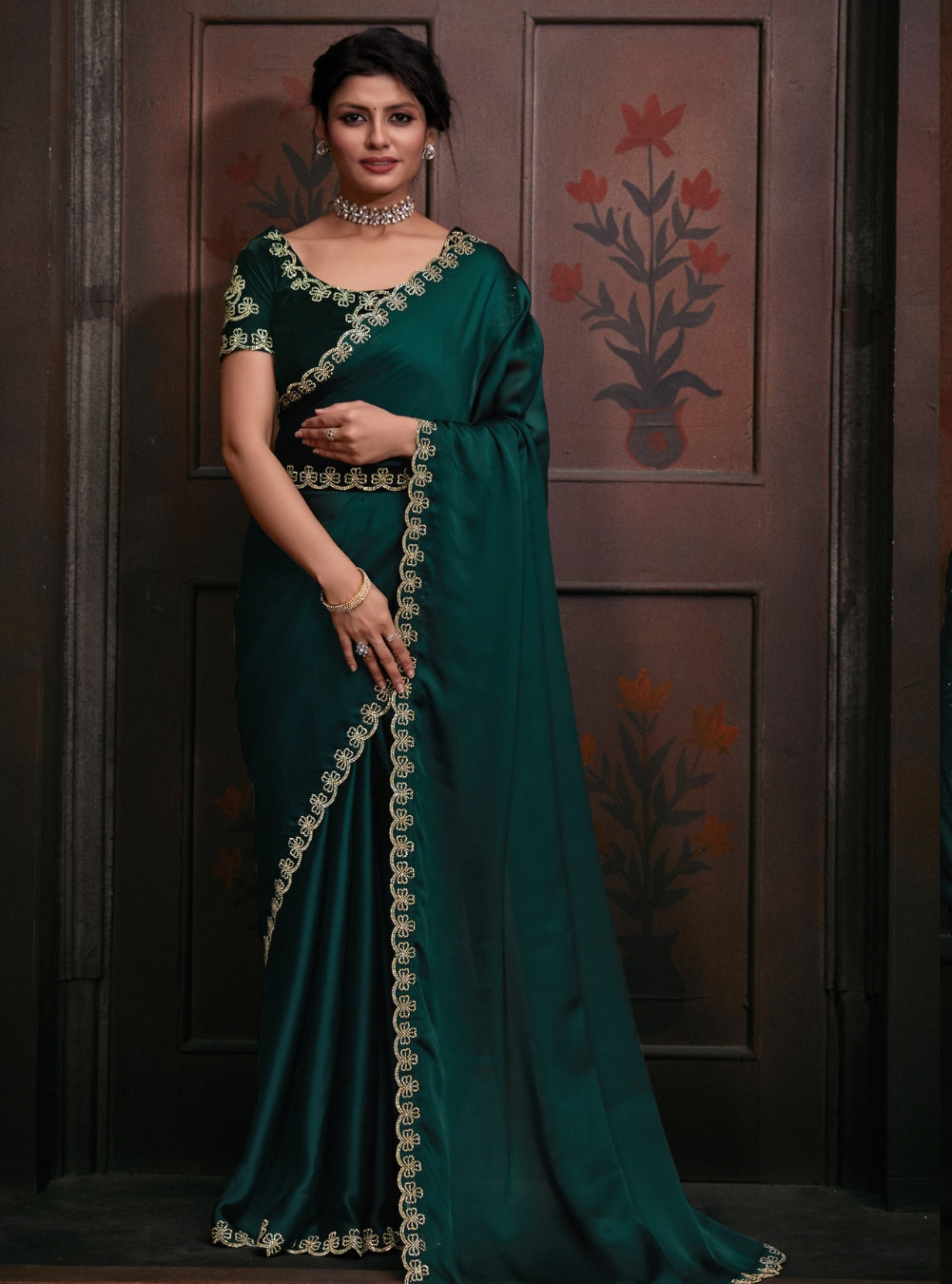 Teal Green Stunning Premium Satin Silk Swarovski Work Saree