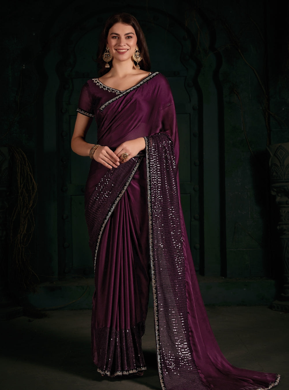 Violet Radiant Premium Satin Sequence Embroidered Work Saree