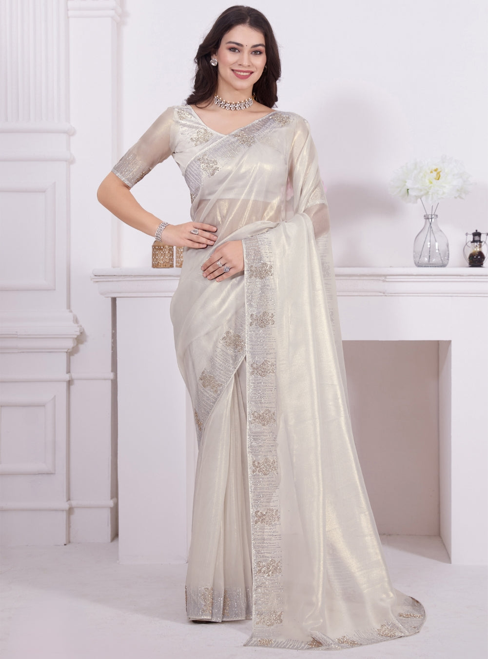 The saree contains an unstitched tone-to-tone stone work blouse piece