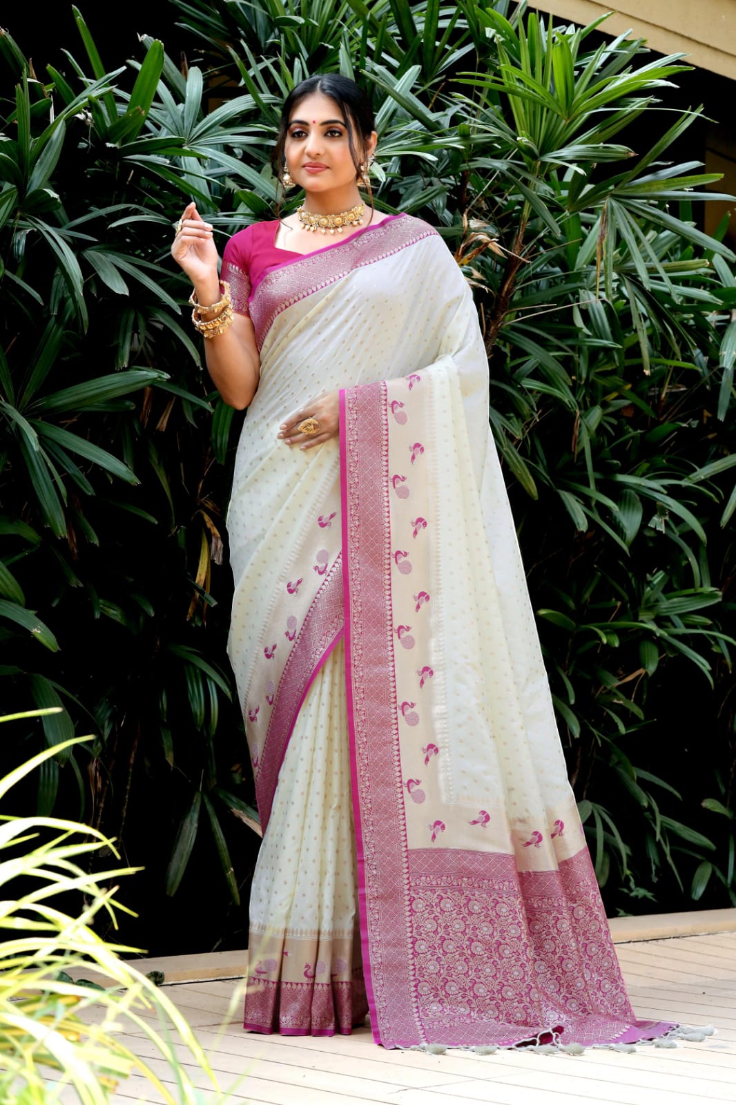 White Banarasi Soft Silk Zari Weaving Paithani Saree With Beautiful Contrast Peacock Border