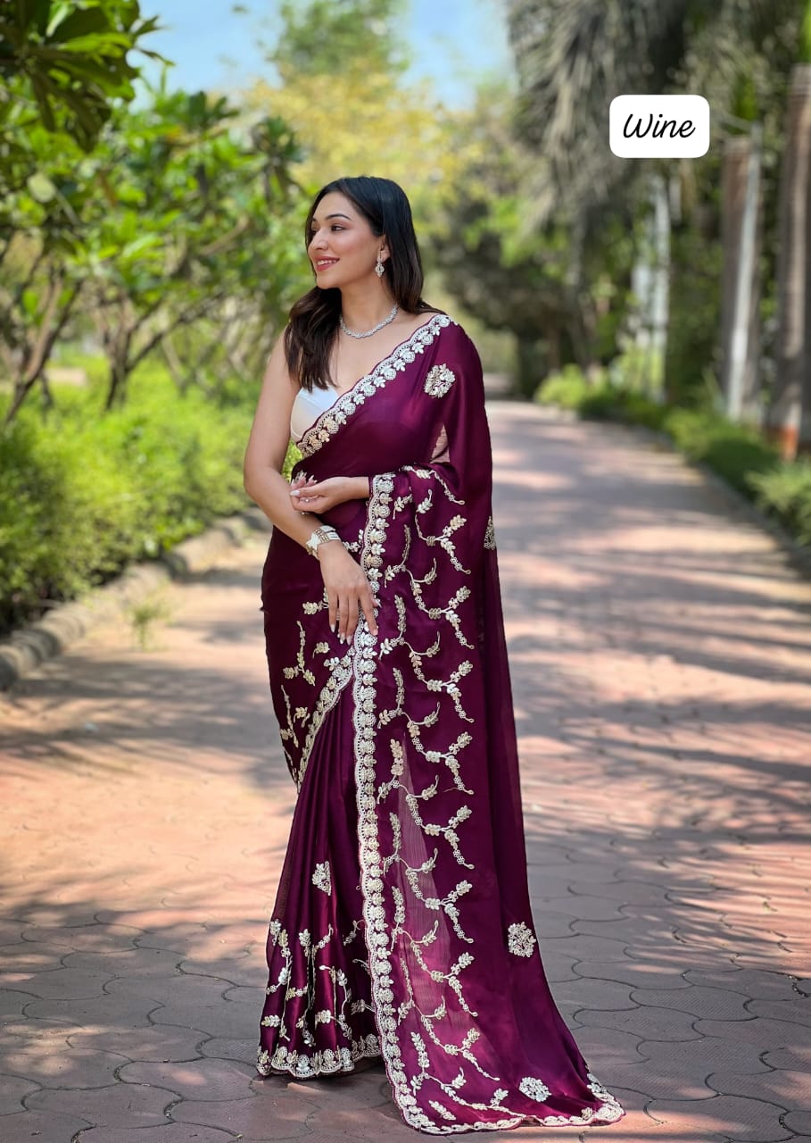 Wine Soft Satin Chiffon Foil Thread Embroidered Work Saree