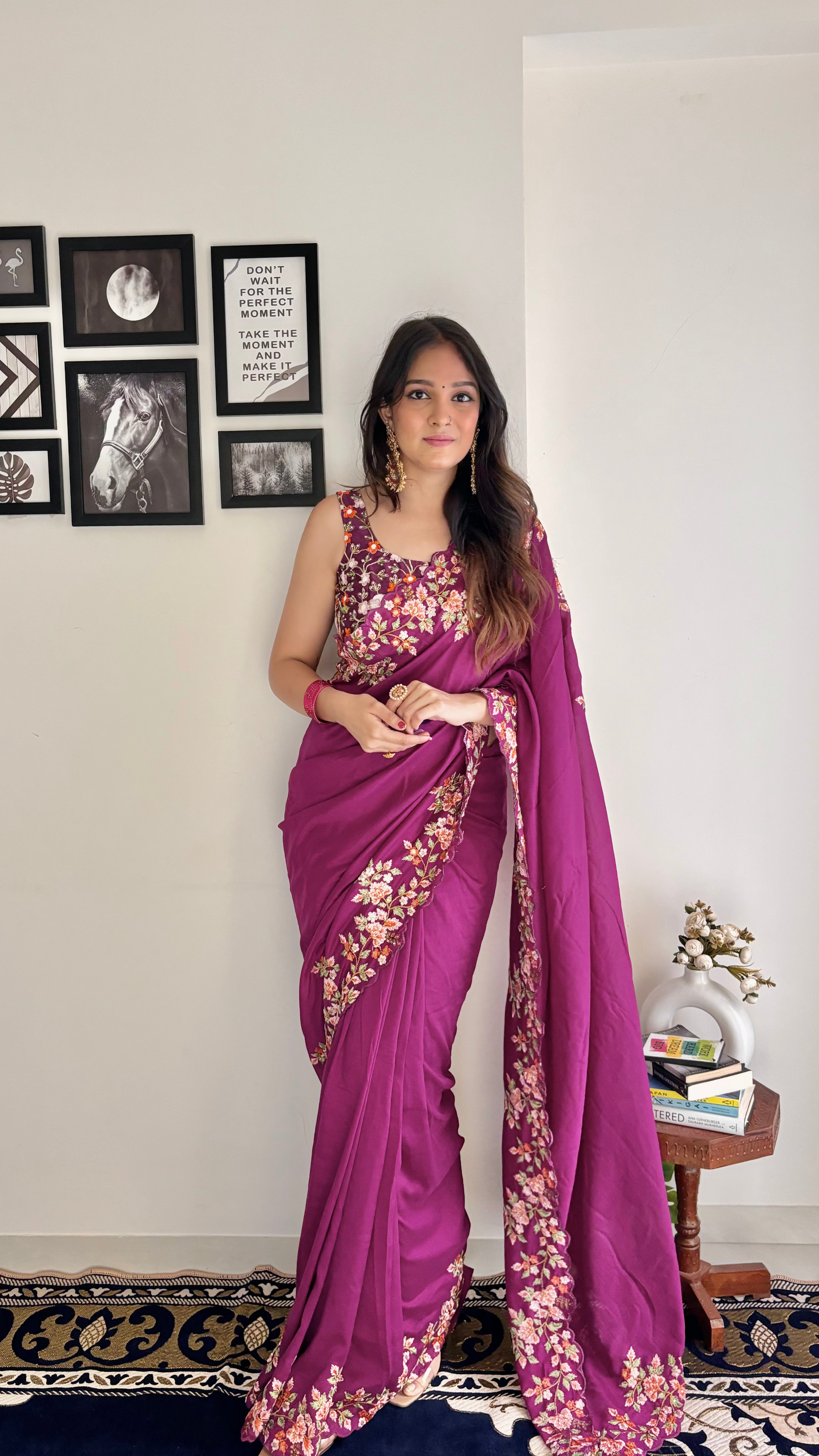 Wine Trendy Georgette Silk Border Multi Thread Embroidered Saree