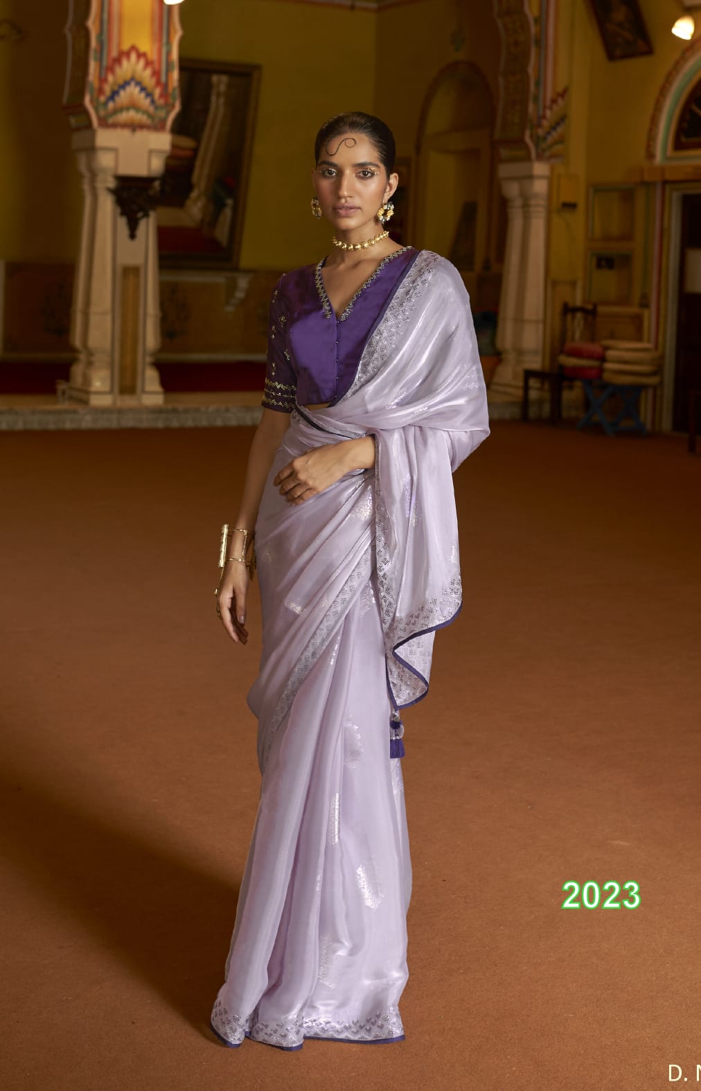 Lavender Soft Tissue Silk Swarovski Work Saree With Contrast Swarovski Work Blouse.