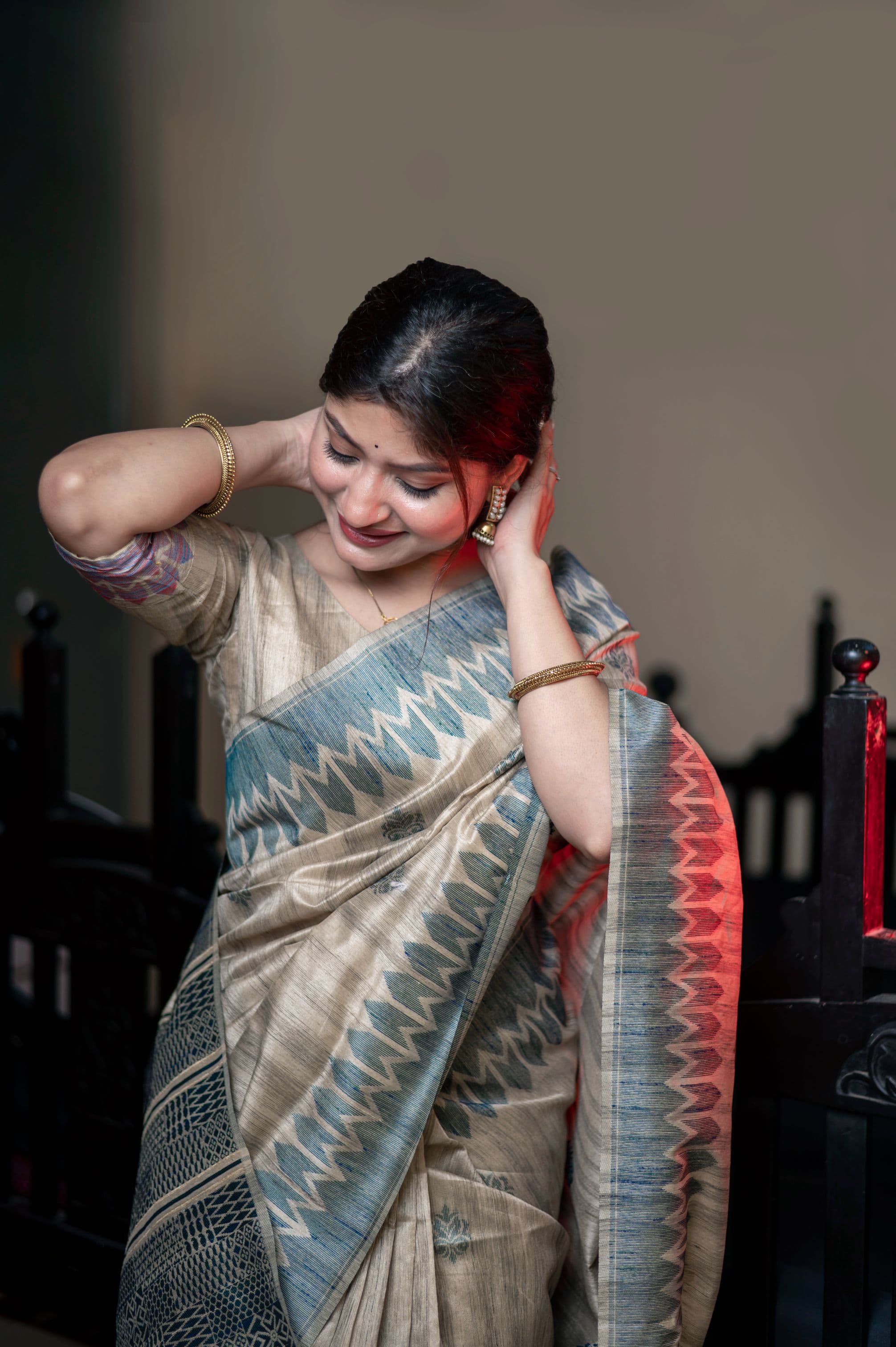 Beige-Teal Blue Classic Tussar Silk Traditional Weaving Pattern Saree