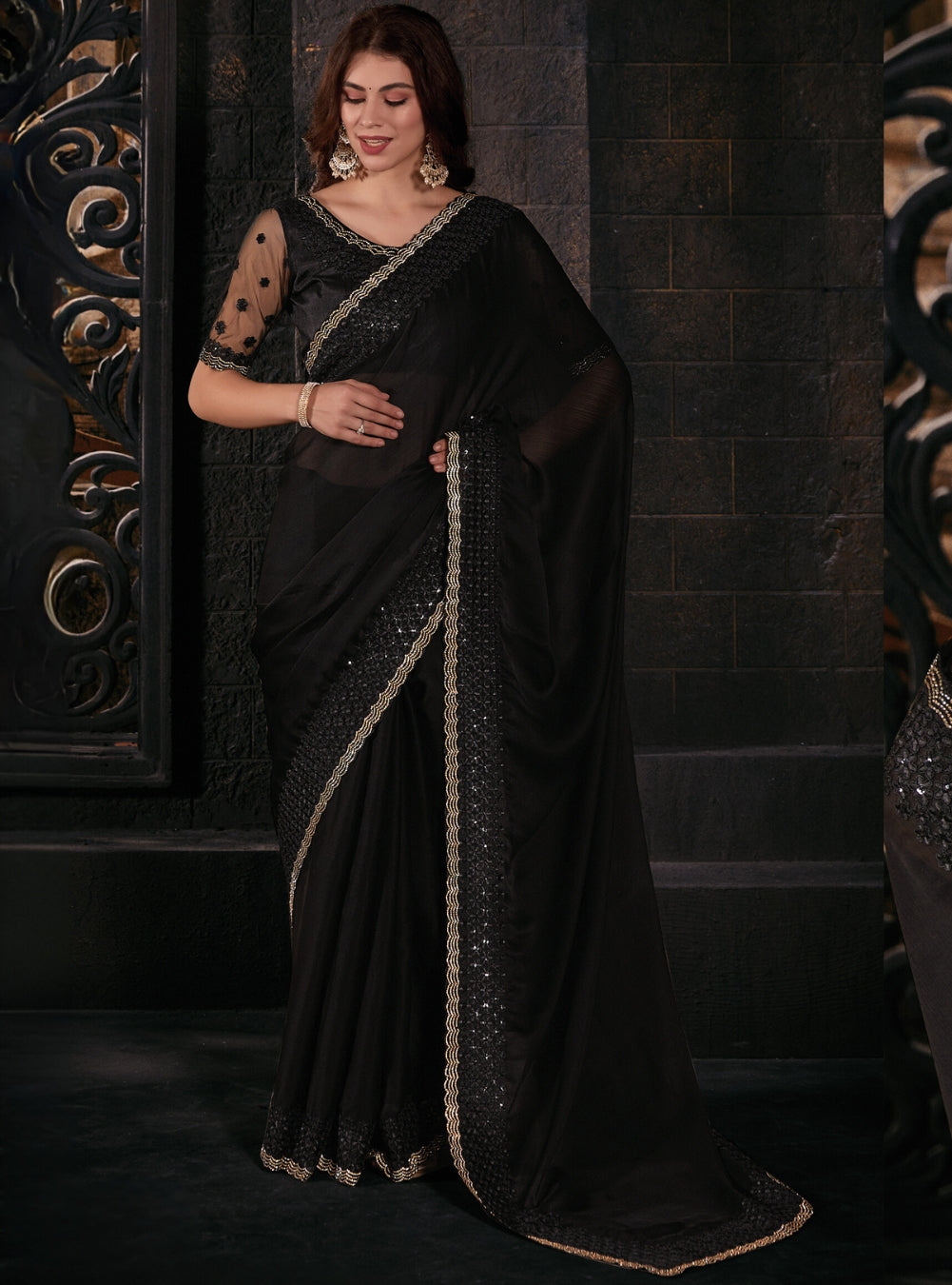 Black Graceful Chiffon Thread Embroidered Stone Work Saree