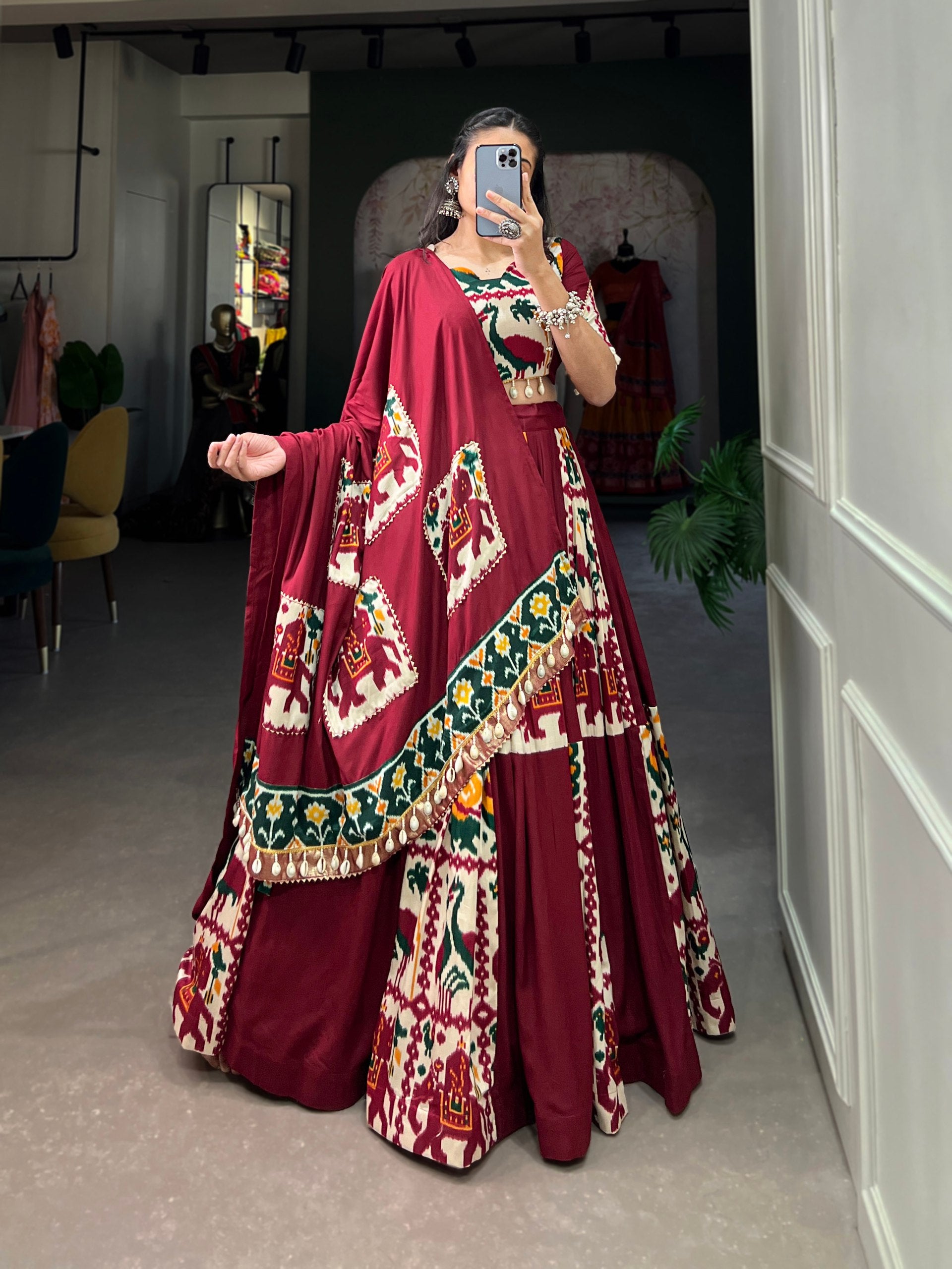 Maroon Rayon Printed Silk Fully Stitched Lehenga Choli