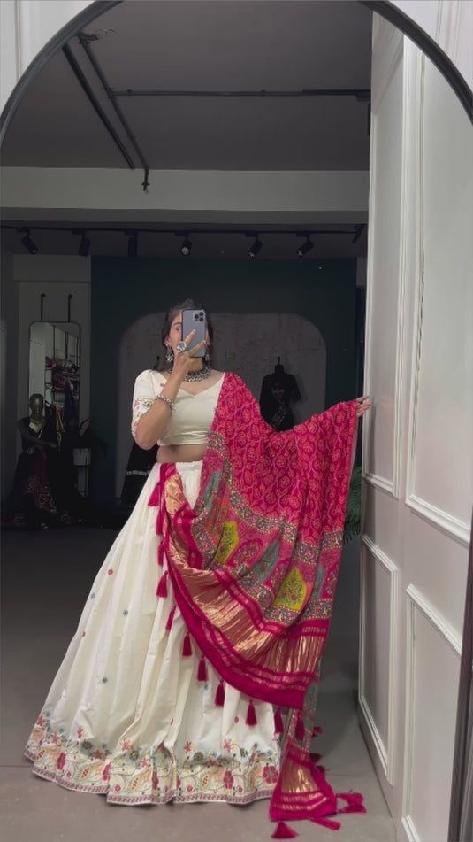 It comes with a printed lagdi patta gajji silk tassel dupatta