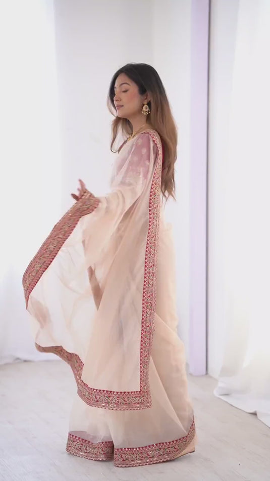 Cream Sequins Embroidered Twill Net Banarasi Crush Saree For Women