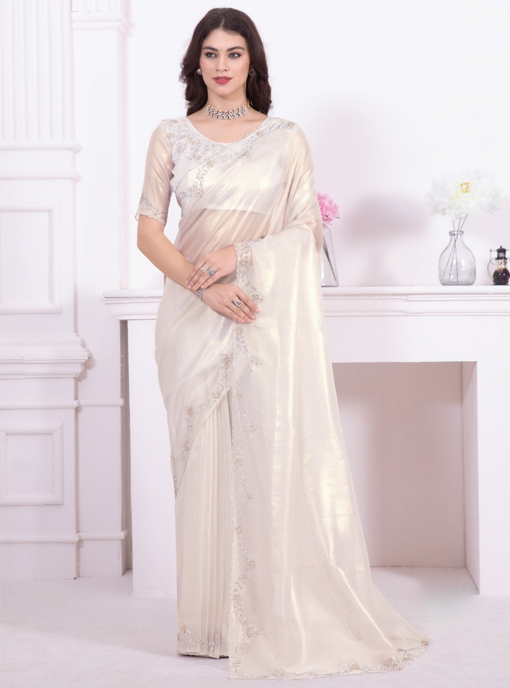 White Beautiful Premium Metallic Organza Stone Work Saree