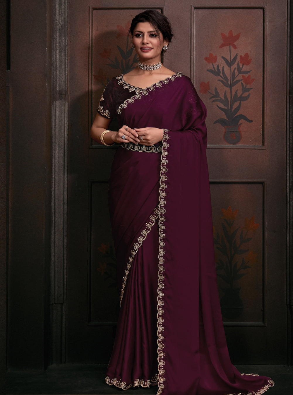 Wine Stunning Premium Satin Silk Swarovski Work Saree