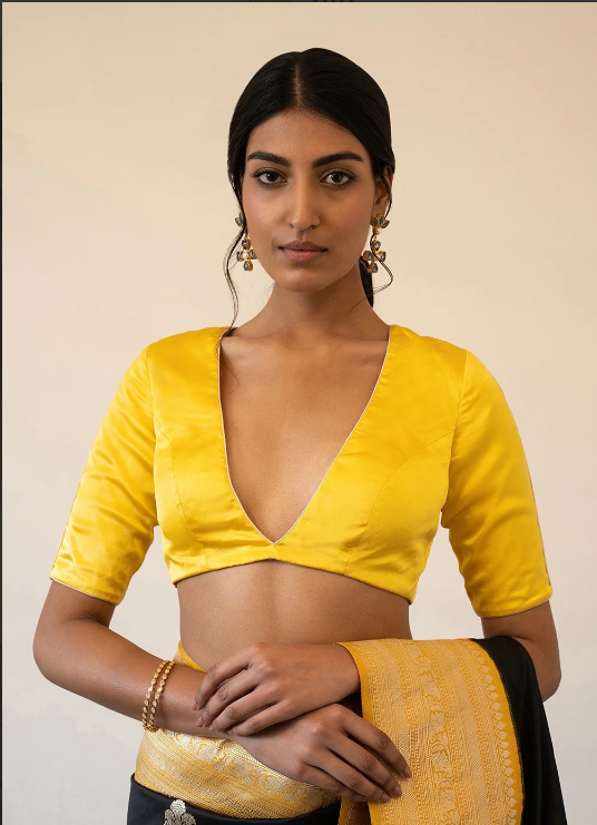 Yellow Satin V Neck Half Sleeve Custom Made Blouse
