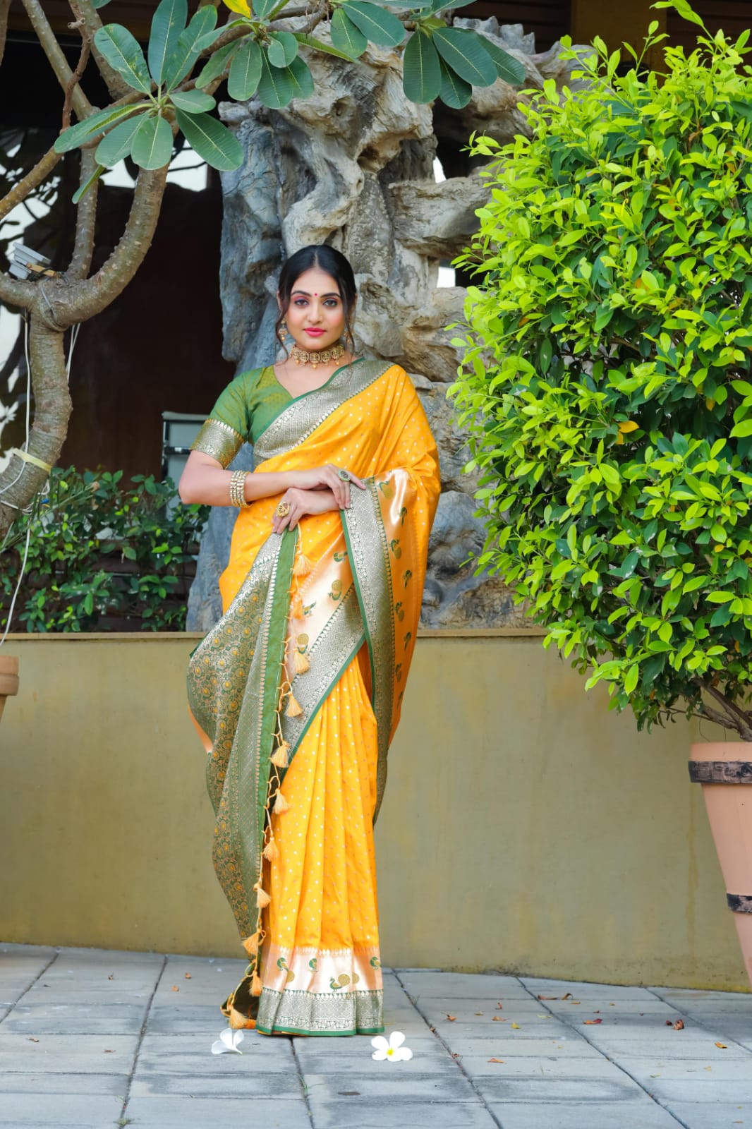 Yellow Banarasi Soft Silk Zari Weaving Paithani Saree With Beautiful Contrast Peacock Border